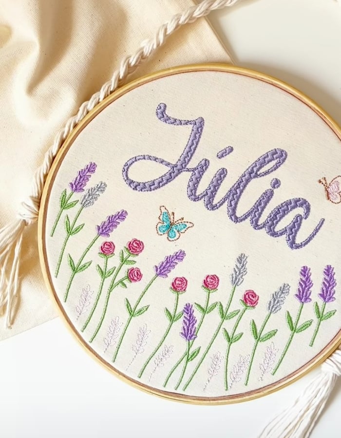 A combinação de fontes cursivas com pequenos elementos florais é um sucesso de vendas, pois transforma o bordado em um objeto de memória afetiva e um presente exclusivo.